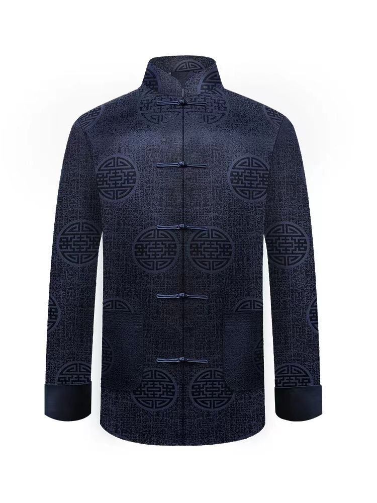 寿衣采用真丝面料,轻盈柔和,手感舒适,为上上之选。中式圆领的设计,平滑整洁,为寿衣增添浓厚的中国风。深色背景之下,有国花牡丹点缀其上,错落有致,雍容典雅,使寿衣有鲜明的层次之感。花纹延续至袖口,细致入微。寿衣镶嵌金色腰线,搭配一字扣装饰,美观大方。内含魔术贴,穿着方便寿衣整体手工制作,走线整齐,乃精工之选,尽显匠人。